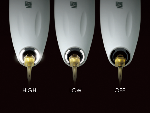 LED-håndstykkets belysning kan justeres ved å skyve på en tast, med mulighet til å velge mellom tre intensitetsnivåer for å passe til behandlingen.
